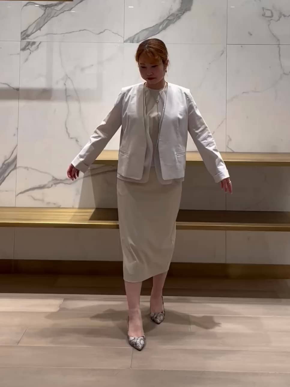 お仕事スタイルです。ジャケットはボックスシルエットのコンパクトなジャケットで、