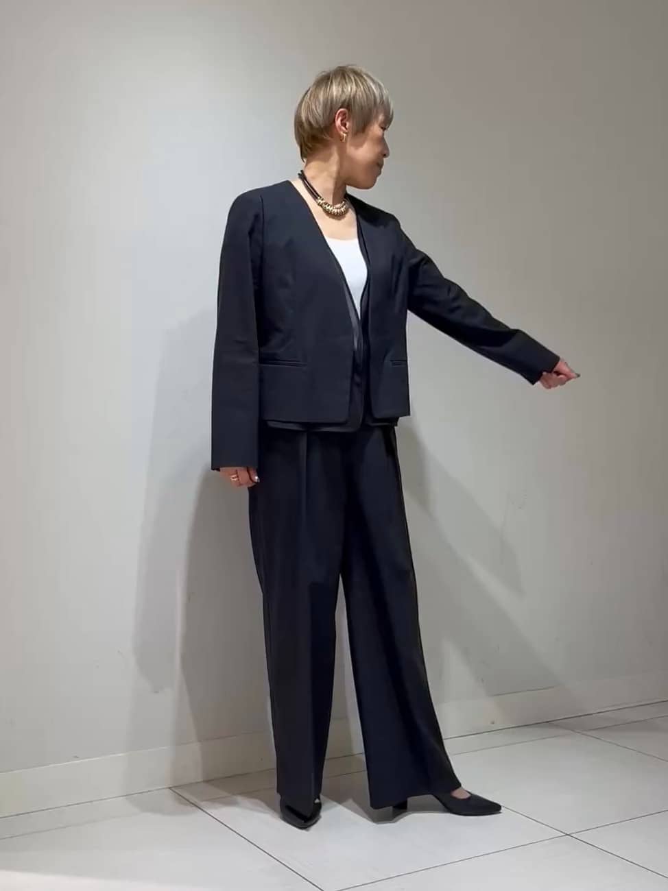 パンツはセミワイドシルエットの美脚パンツ。ウエストはインゴム仕様で履き心地のよさも◎