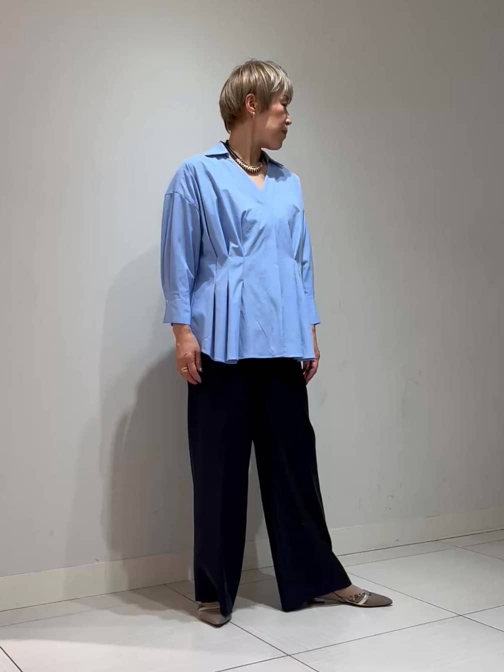 パンツはシルキーな素材のワイドパンツでリラックス感のあるシルエットと