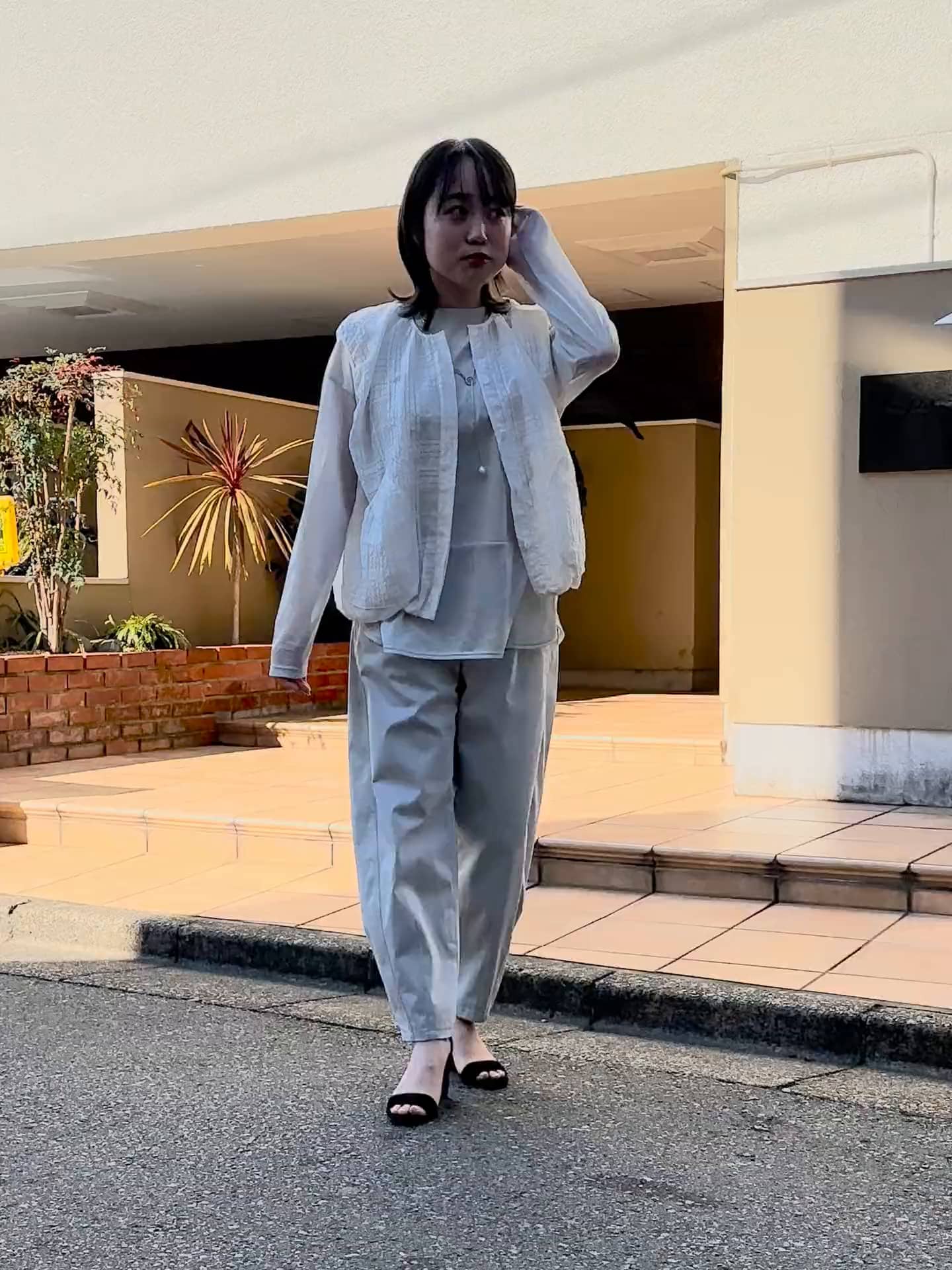 リラクシーなカーブシルエットのパンツがこなれた雰囲気を醸し出し、足元のブラックが全体を引き締めています。ナチュラルながらも洗練されたスタイリングで、カジュアルからお出かけまで幅広く活躍する着こなしです。
