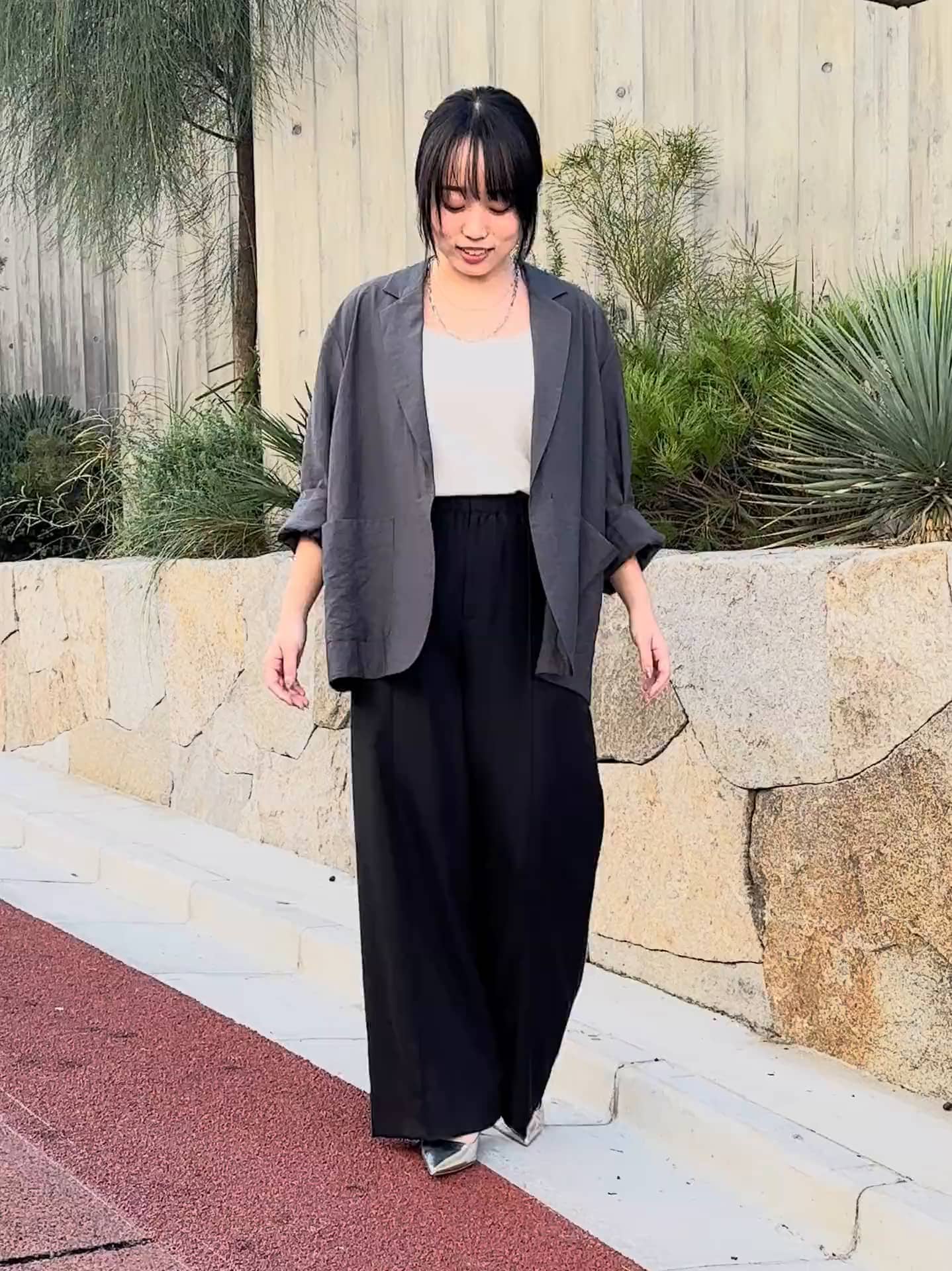 程よいシアー感と軽やかさのあるオーバーサイズのテーラージャケットに、しなやかな落ち感のあるワイドパンツを合わせたスタイリングは、マニッシュになりすぎず女性らしさを引き立て、センターシームステッチがスッキリとした印象を演出しつつ、シンプルなトップスでデコルテをすっきり見せ、足元のメタリックシューズが華やかさを添えることで、抜け感がありながらもきちんと感をキープしたこなれ感のあるスタイルに!