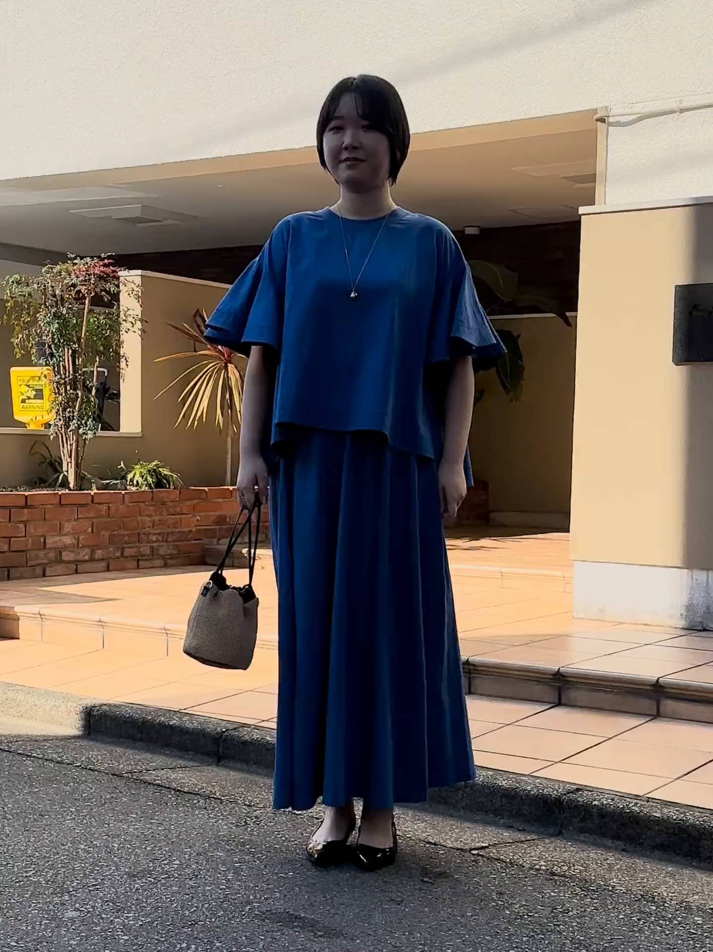 環境配慮型素材を使用した軽やかで上品なセットアップは、フレアーシルエットのブラウスとギャザーたっぷりのロングスカートが女性らしさを引き立てます。