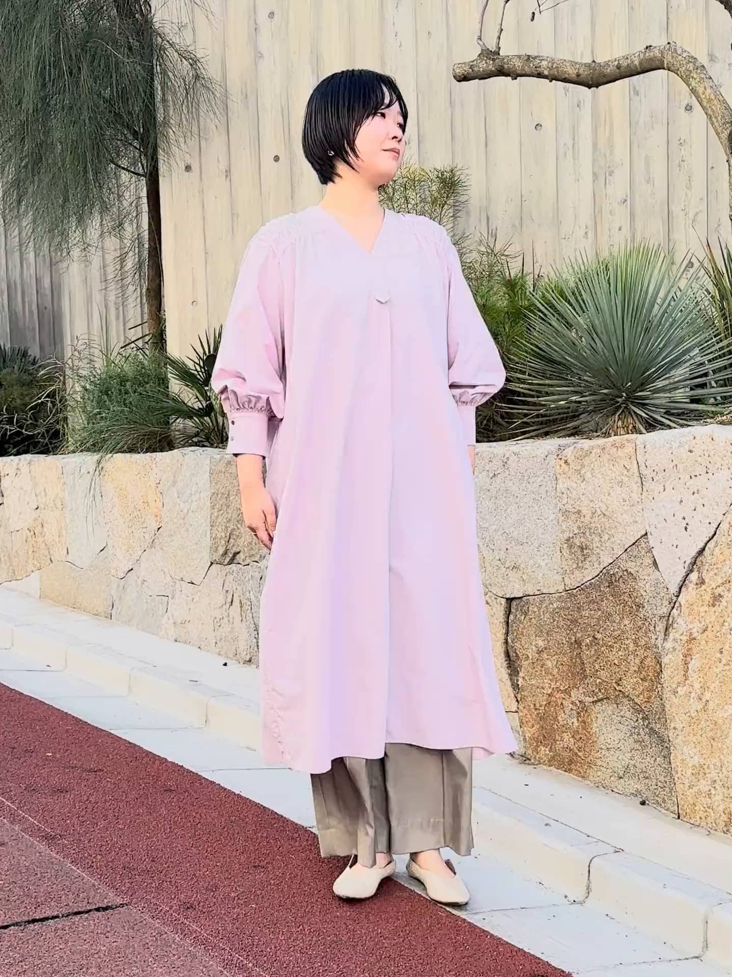軽やかなラベンダーカラーのロングワンピースを主役に、落ち感のあるワイドパンツをレイヤードしたリラックススタイル。