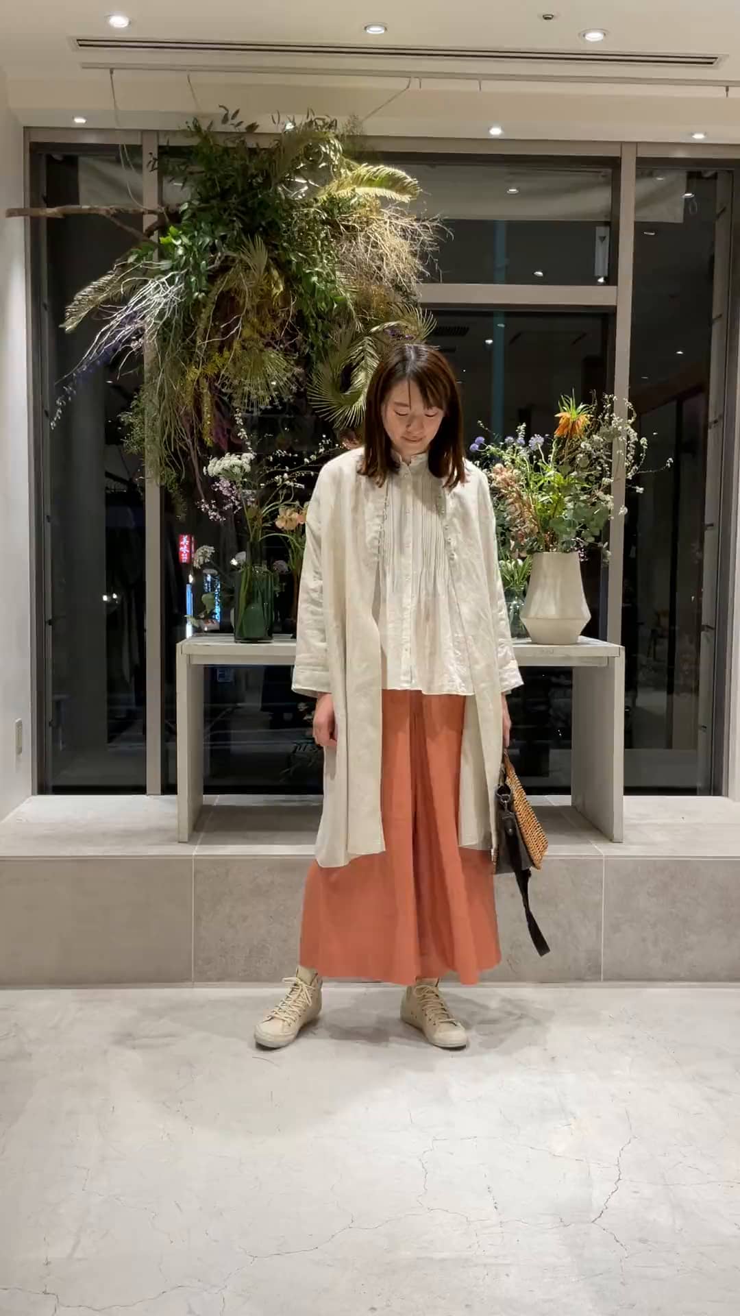定番のグランジリネン素材ブラウス、程良い厚みの平織りシリーズは麻素材でもきれい見えするため通勤着としても◎。LOISIR定番のフロントタックパンツは発色がきれいなオレンジ見えするピンクが素敵です。