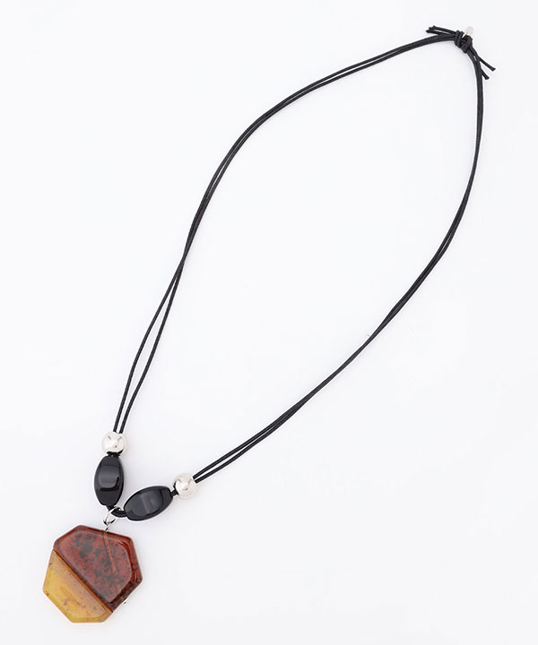 華やかさをプラスにするため、大ぶりのアクリルネックレスをアクセントに。