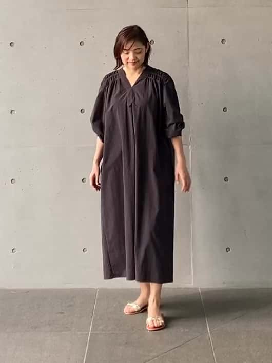 たっぷりと入ったギャザーがポイントのワンピースは、Vネックのため抜け感も出てスッキリ見えもかないます。