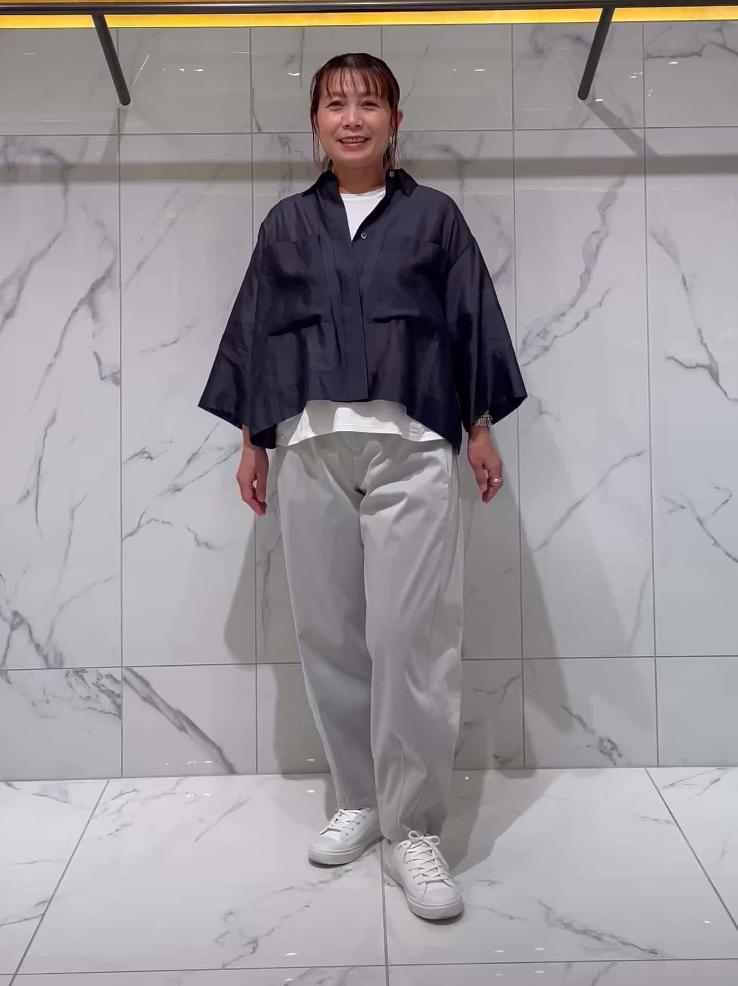 シアー感のあるシャツカラーブラウスを羽織り風に着こなしてみました。