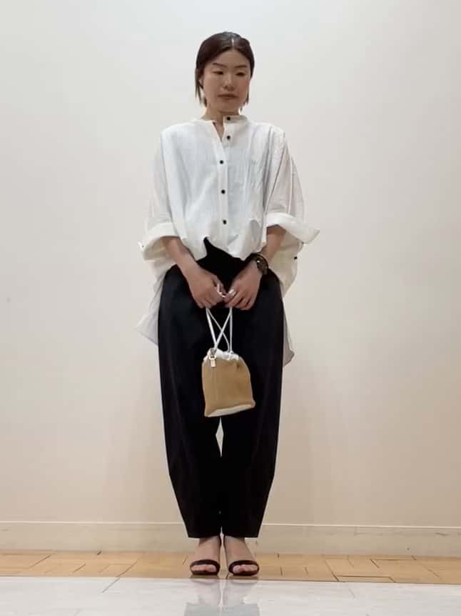 麻混のオーバーサイズのブラウスの前をインすることで、ボリューム感を抑えられスタイルアップ見えが叶います。