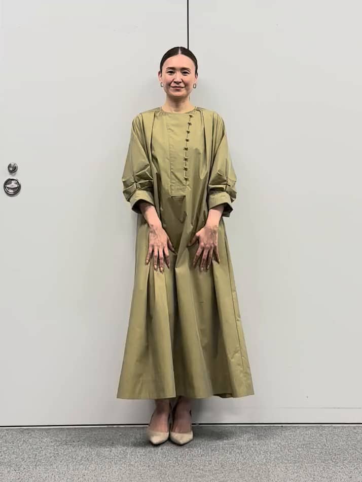 長めの着丈ですが、首周りのスッキリ感や胸元のクルミボタンでのアクセント、
