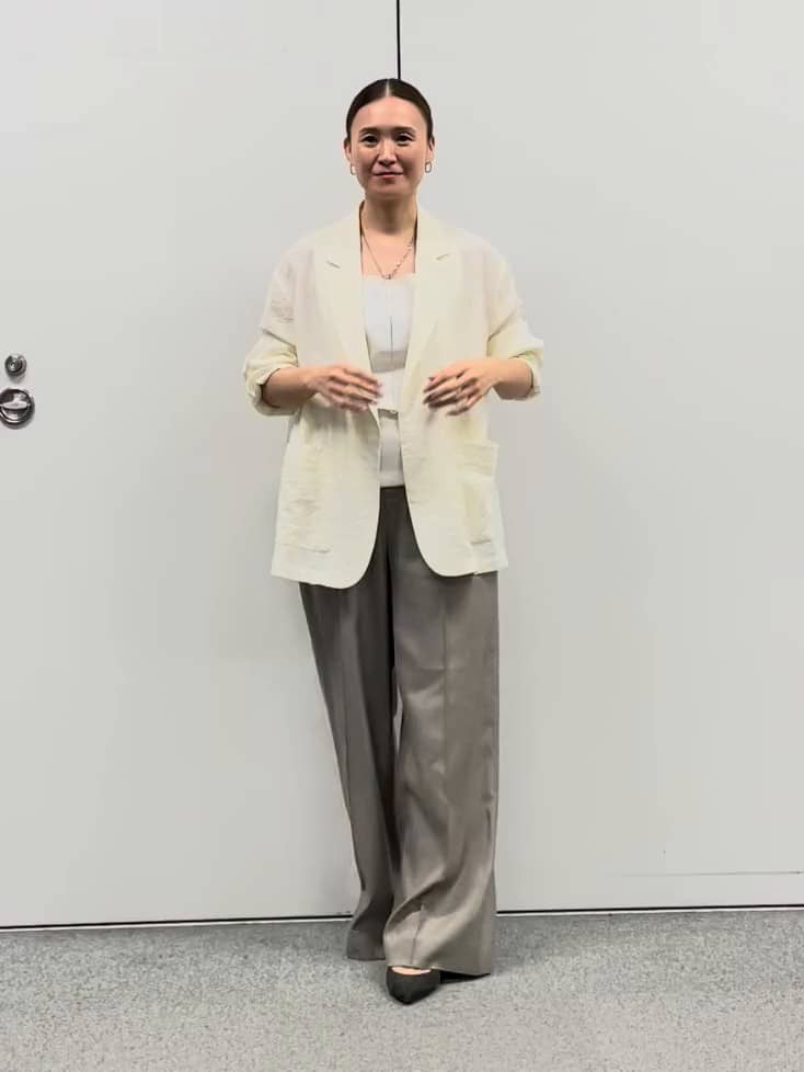 オーバーサイズのテーラードジャケットで程よく抜け感あるスタイルに。ジャケットは生地も軽く涼しげなので、今時期の日差し対策にもおすすめです!パンツもキュプラ混のしなやかなデザインでノンストレスで履けます!
