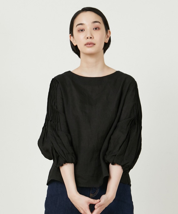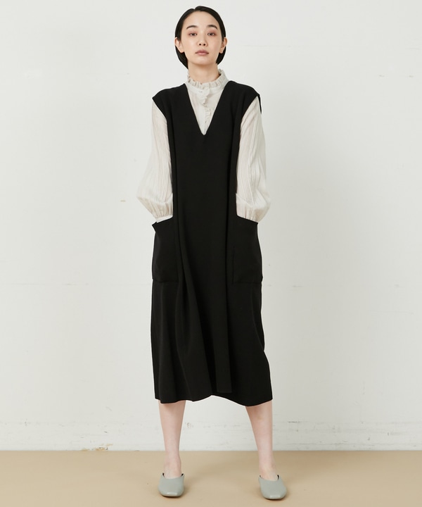人気のミラノリブを使用したニットジャンパースカートにクロのリネンのブラウスを合わせて大人っぽく。中に履いているイージーパンツは履き心地が良く色違いで欲しくなります!