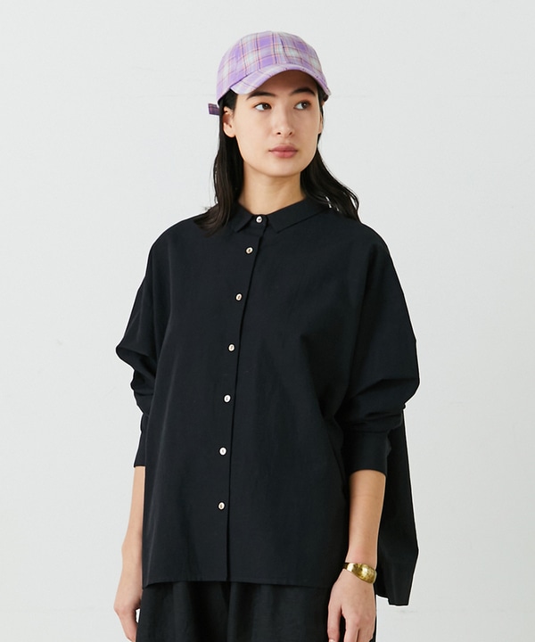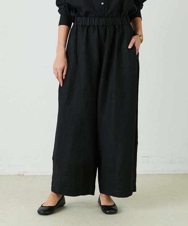 全体をブラックでカッコ良くまとめたワントーンコーデ。上下とも麻素材なので重たい印象になりません。パンツはウェスト部分のギャザーとタックで気になる腰周りをカバーしてくれます。