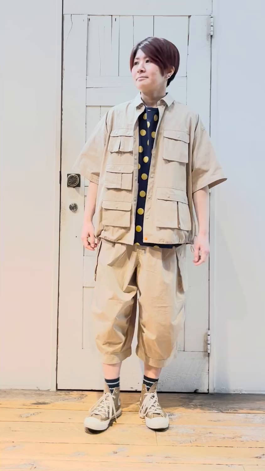 着用感 : 生地は適度なハリ感があり、ポケットがたくさんあるデザインが特徴的です。
