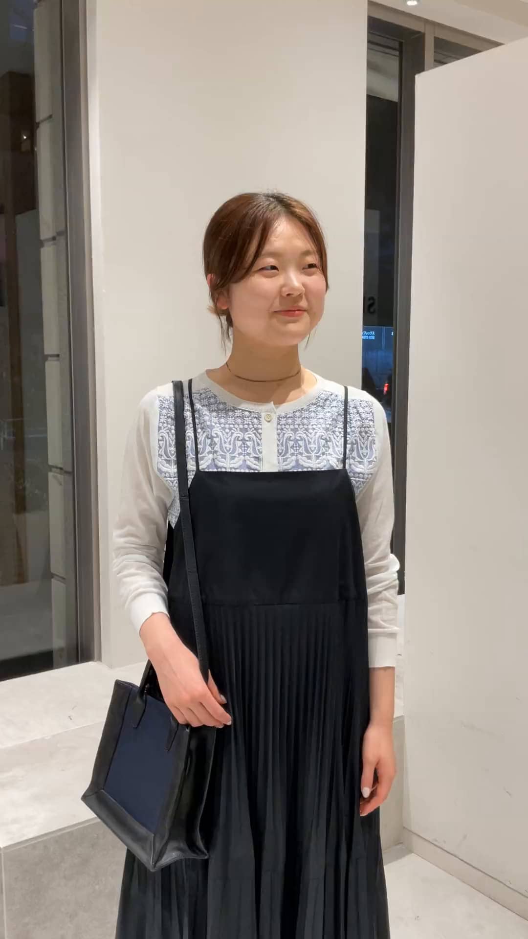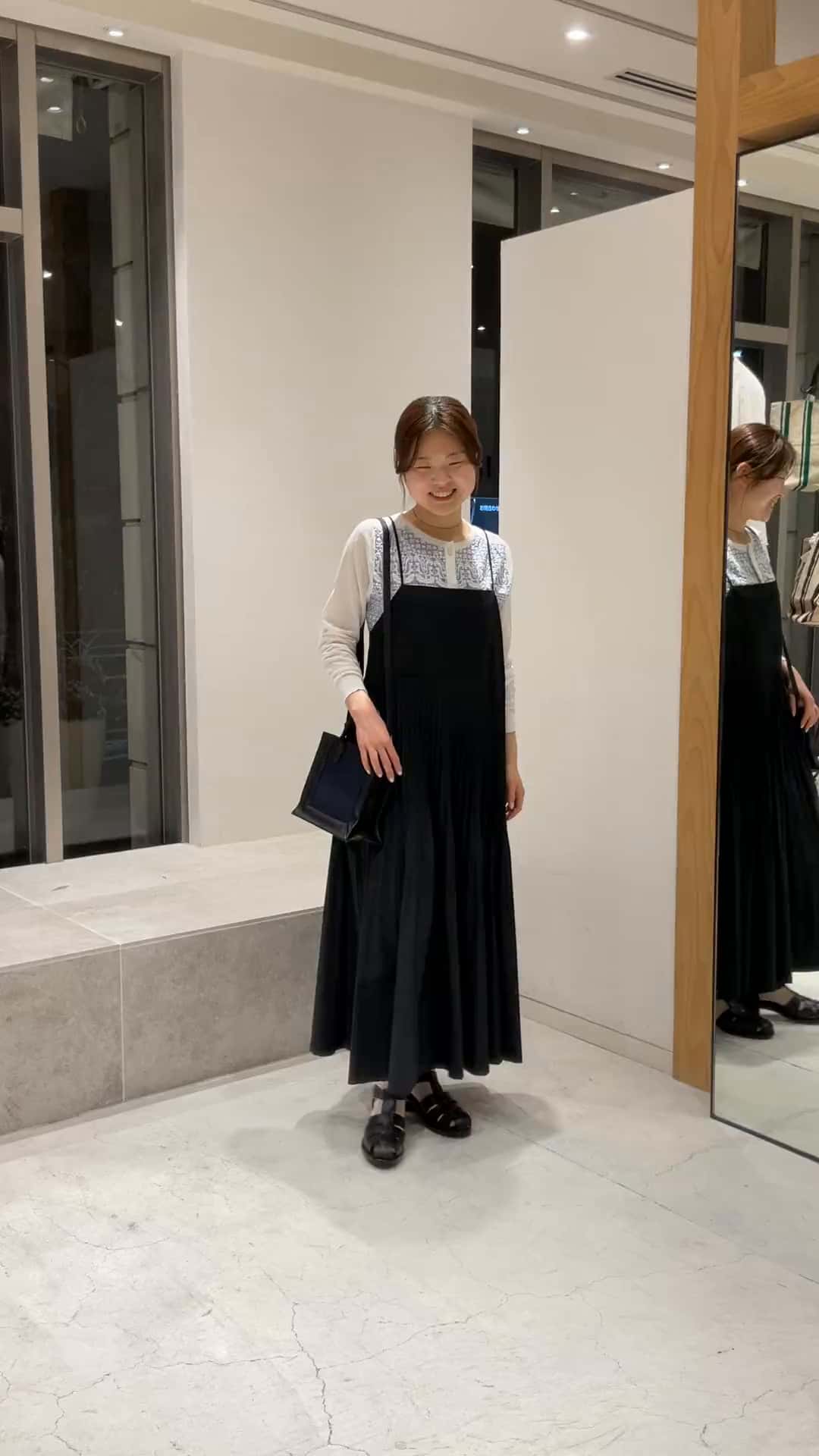 お出かけコーデ。ハリ感のある素材にプリーツがふんわりで女性らしくエレガントな印象のジャンパースカート。