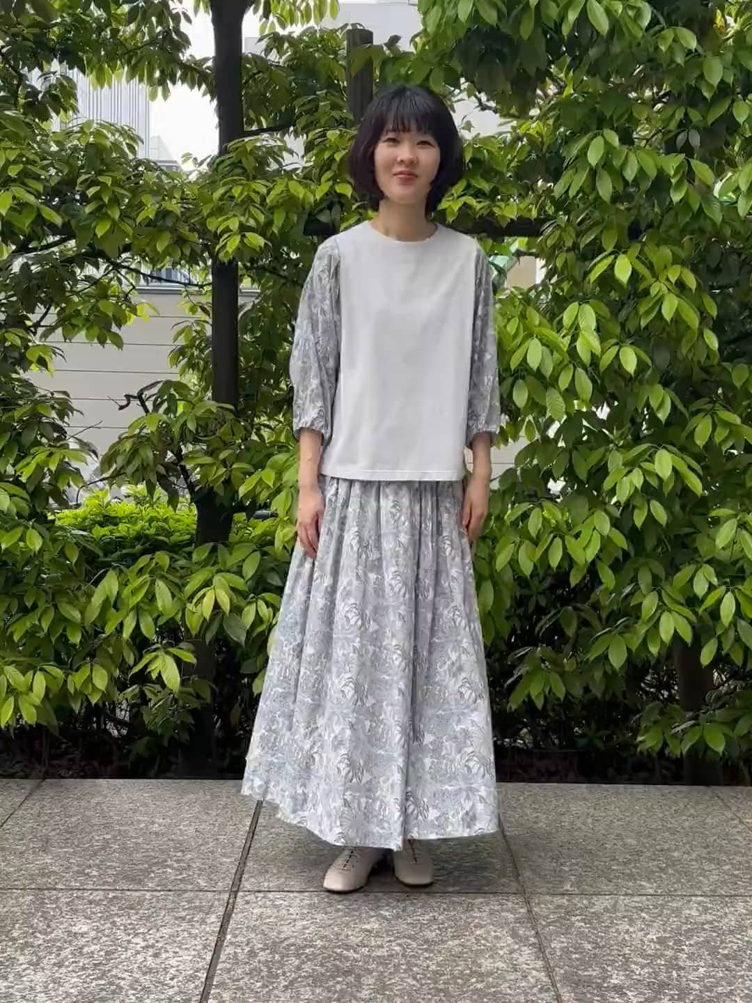 お揃いの柄ののスカートは裾へ向かってのラインが美しく、着ているとくるっと回りたくなる1枚です。