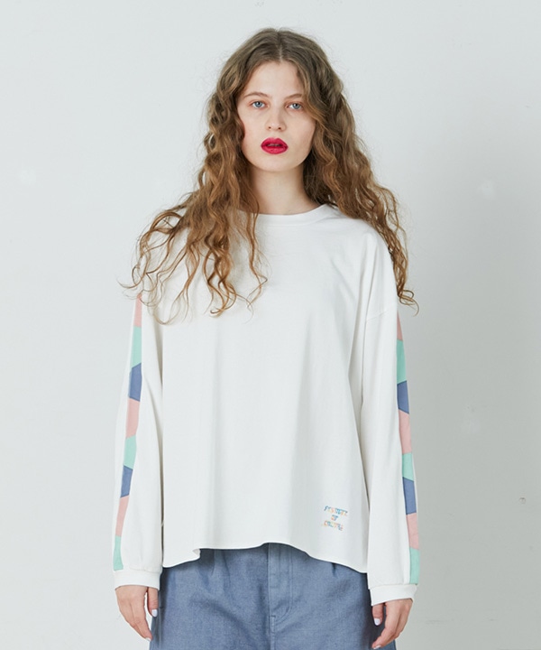 袖にカラフルなパッチワークが入ったロンTを使ったコーディネート。