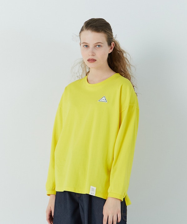 鮮やかなイエローのロンTとシンプルな半袖裏毛の組み合わせは、色の組み合わせが目を引くコーディネートです。