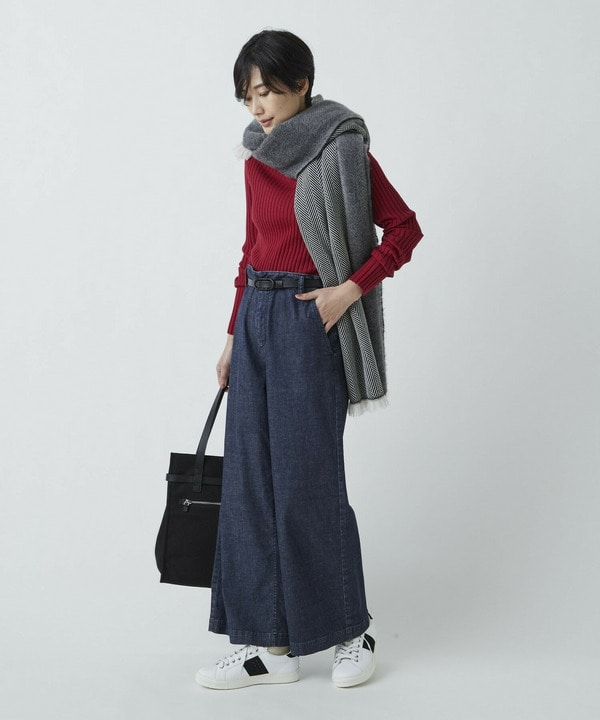 フェミニンになりがちなピンクのブラウスをワイドデニムと