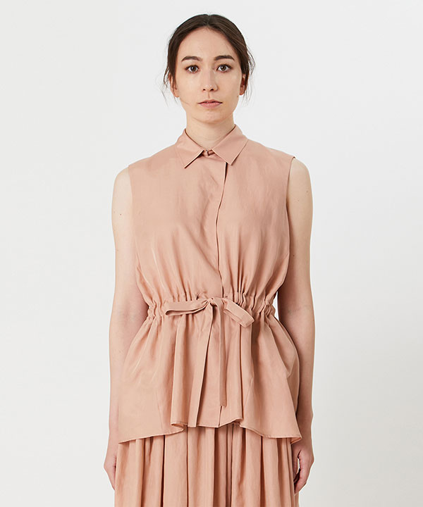 春らしいピンクカラーのブラウスはウエストをギャザーで調節できるので
