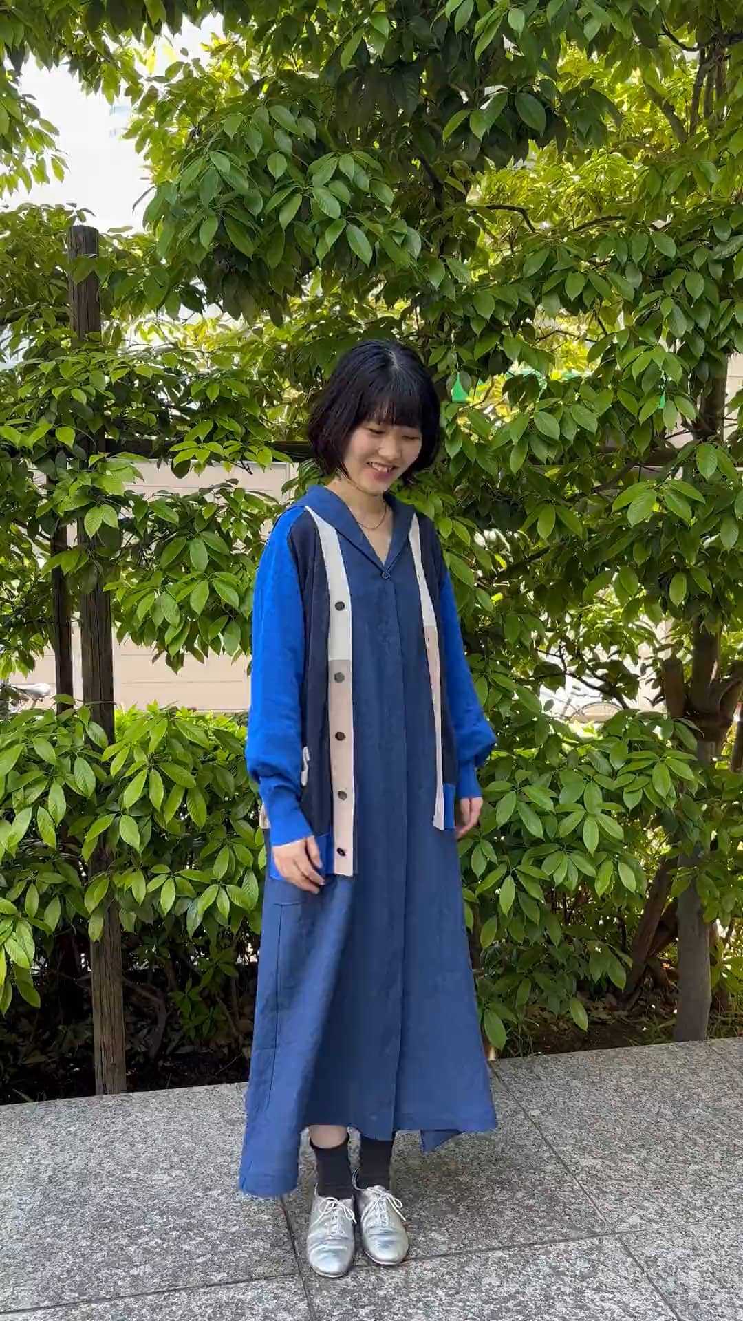 セーラーカラーのワンピースにパッチワークカーディガンを合わせました。カーディガンはお尻まで隠れる嬉しい着丈◎ベーシックなデザインだからこそ配色が映えます✨これからの季節、冷房対策にもってこいの薄い生地感です。