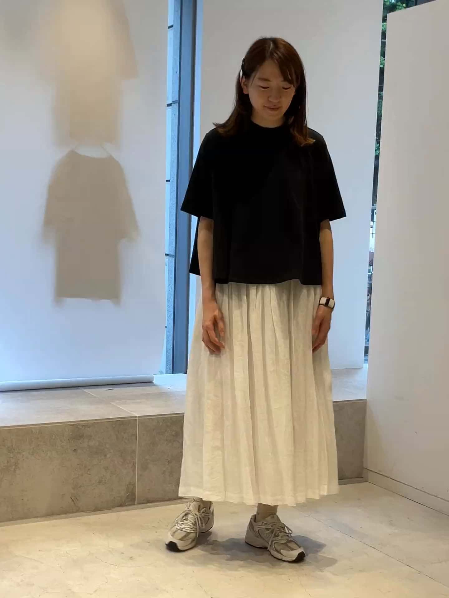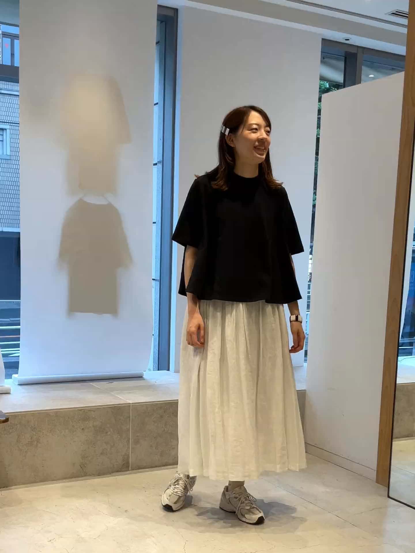 コンパクトミニ裏毛のカットソーは柔らかくスウェットのような質感で、1枚着としてもおすすめ。ラミーのスカートは裏地付きのため、そのまま安心して着ていただけます。