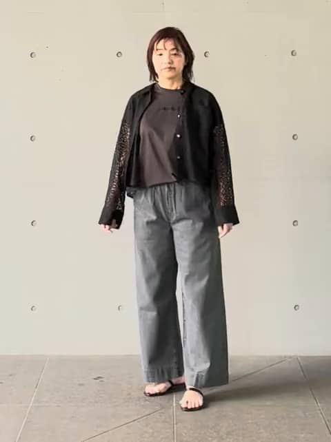 トレンドのブラックのレース短丈シャツにグレーのタンクトップとワイドデニムを合わせ、