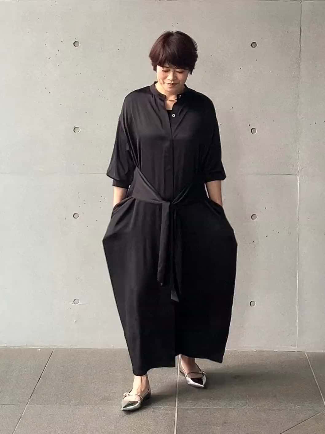 サテン地のシャツワンピースで、サイドについたベルトをゆるくまいて