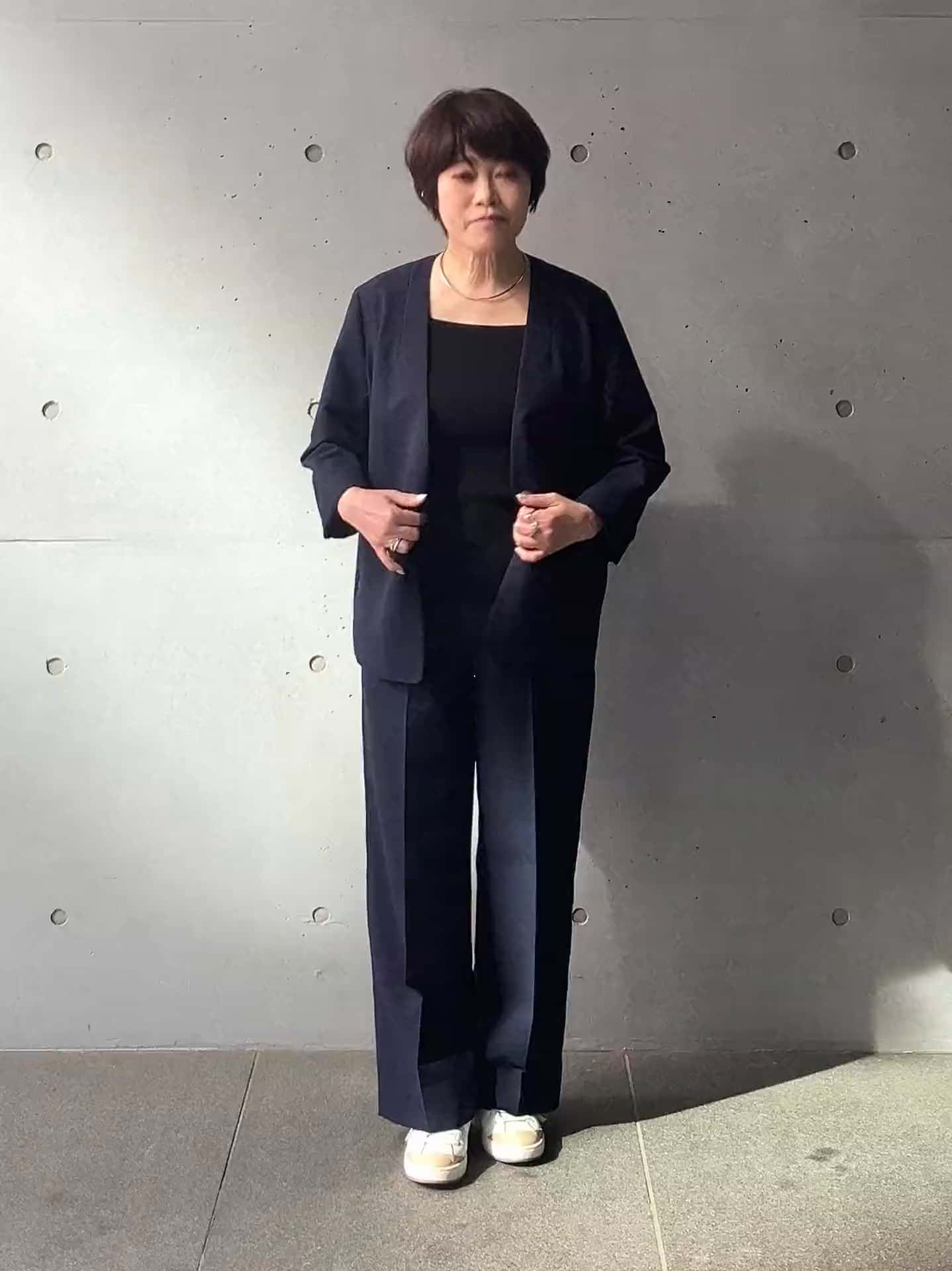 凹凸感のあるサッカー生地が涼しげな印象を与えるノーカラージャケットとワイドパンツのセットアップは、軽やかさと上品さを両立した初夏のきれいめコーディネートです。ノーカラーで顔まわりはすっきり、ワイドシルエットが程よい抜け感を生み、大人の余裕を感じさせるスタイリングです。