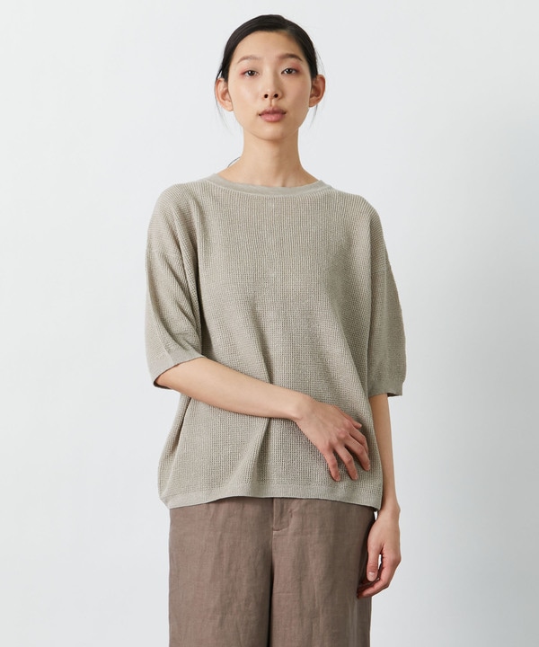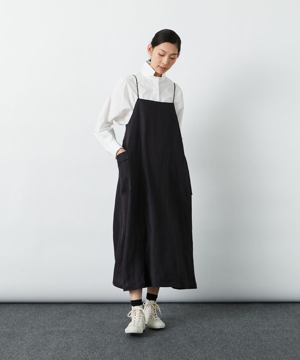 ベージュニットとクロのジャンパースカートでシックにまとめました。ニットはワッフル編みでカジュアルながらリネンで大人っぽさが魅力です。ジャンパースカートは肩紐で着丈の調節が可能なので身長を選ばず着用ができます。