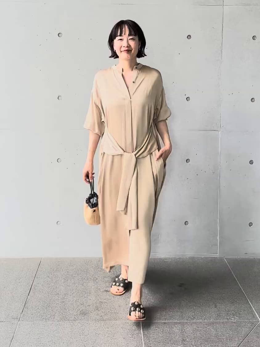 上品なサテンの光沢と落ち感が美しいロングシャツワンピースです。