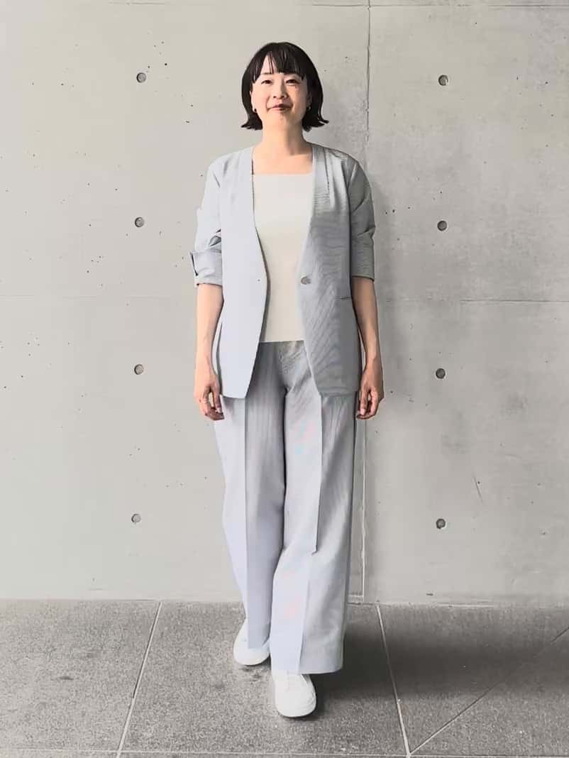すっきりとしたノーカラージャケットに程よい太さのワイドパンツでカジュアルさも残しつつ
