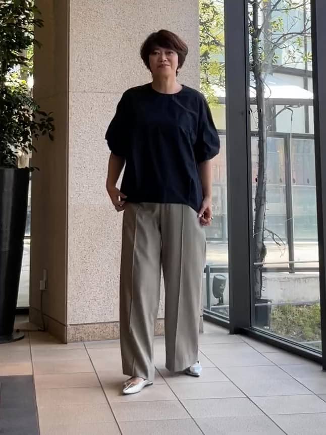 程よい落ち感のあるワイドパンツで、縦ラインが強調され脚長&細みえ効果も!