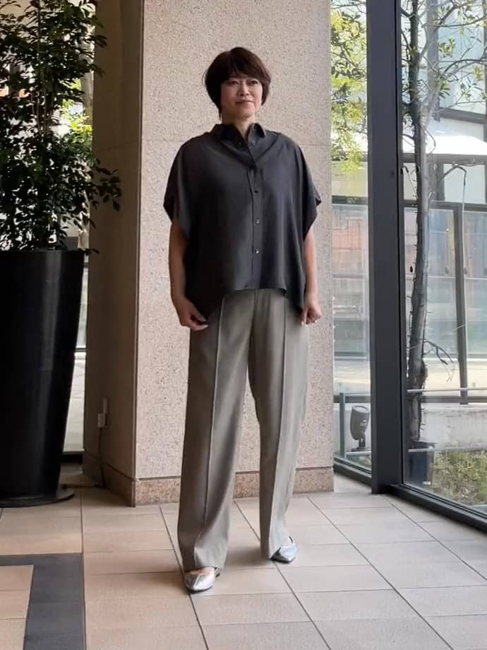 チャコール×カーキの組み合わせは落ち着きがありこなれた印象で