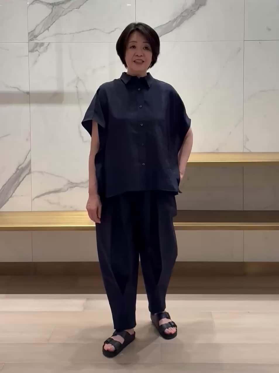 しなやかな光沢感が魅力のポリエステルケープシャツに、立体的なシルエットが映えるボックスタック入りのバレルパンツを合わせた、洗練されたスタイルに。ケープシャツの程よいドレープが動きに表情を与え、パンツの構築的なフォルムがモードな存在感を演出します。