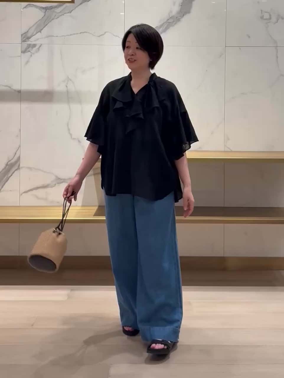 フリルのディテールが上品な華やかさを演出しつつ、ワイドデニムのゆったりとした