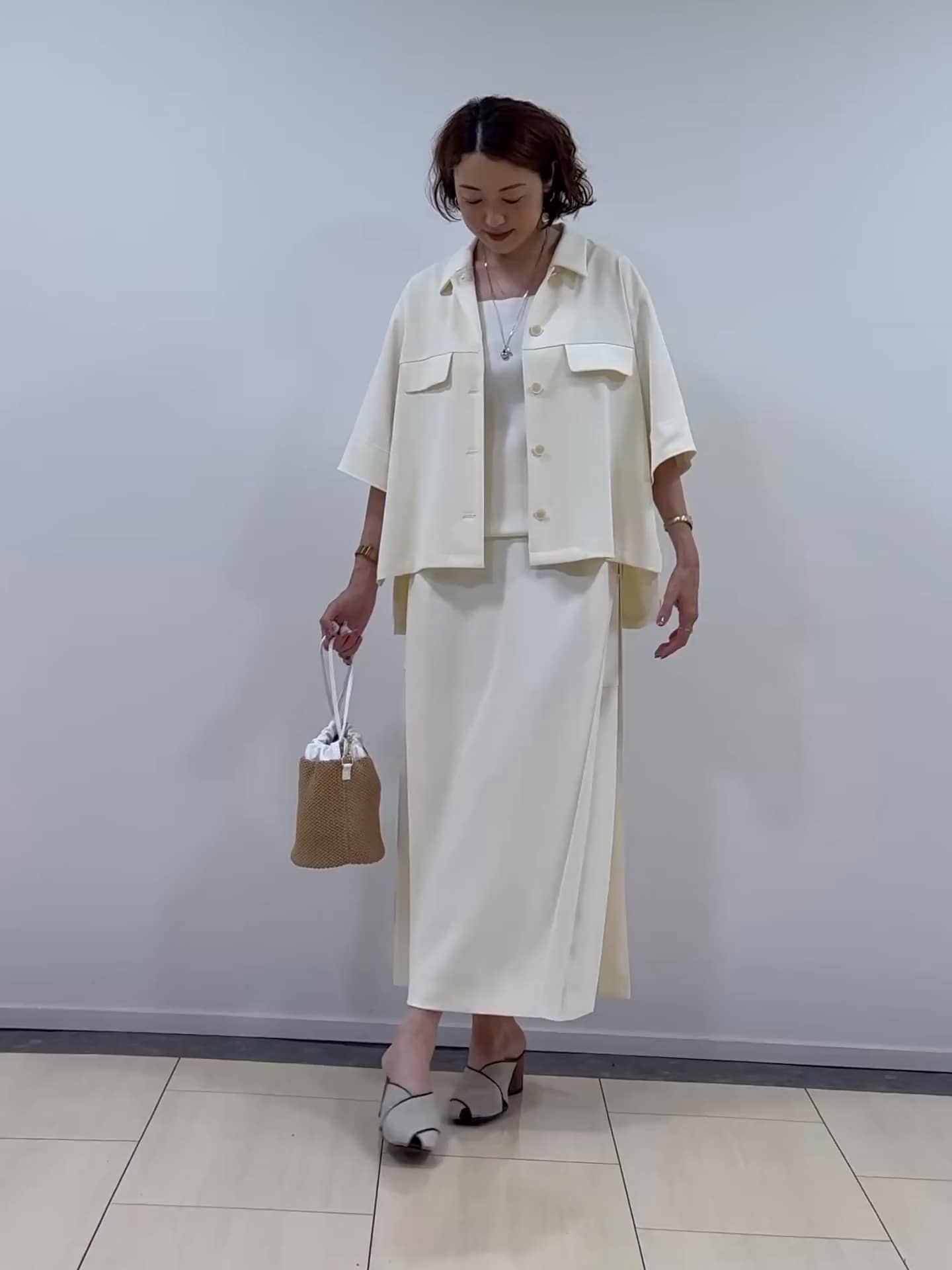 清潔感あふれるオフホワイトのジャケットライクな半袖シャツは、前を開けて羽織るだけで抜け感たっぷり。