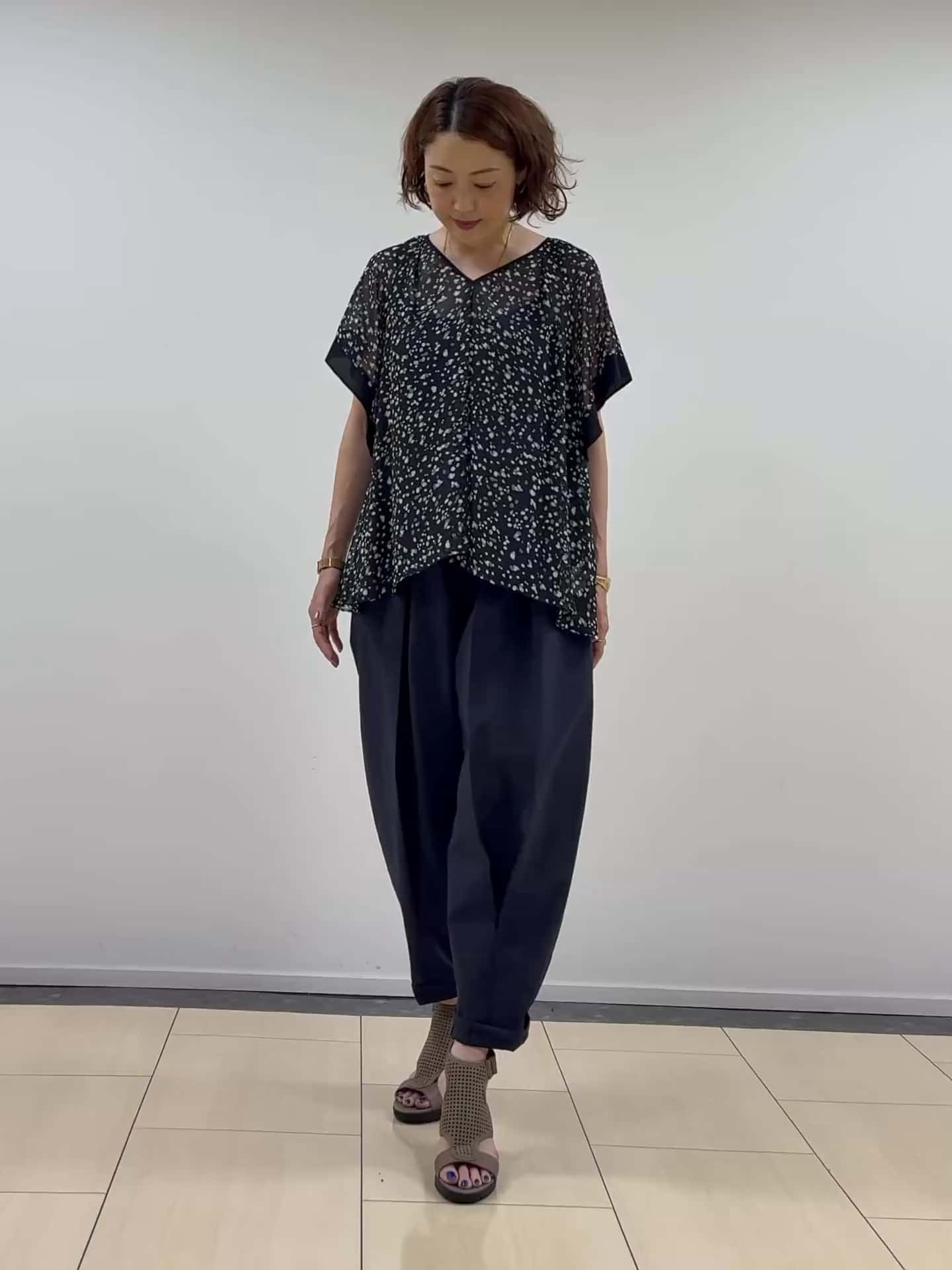すっきりとしたVネックに要所にタックが入った立体感のある変化がさりげないポイントです。