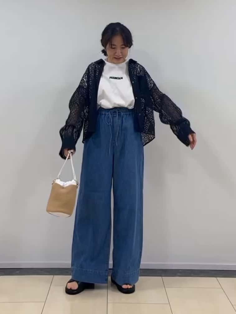 ブルーのイージーワイドデニムを合わせた大人の抜け感カジュアルスタイル。