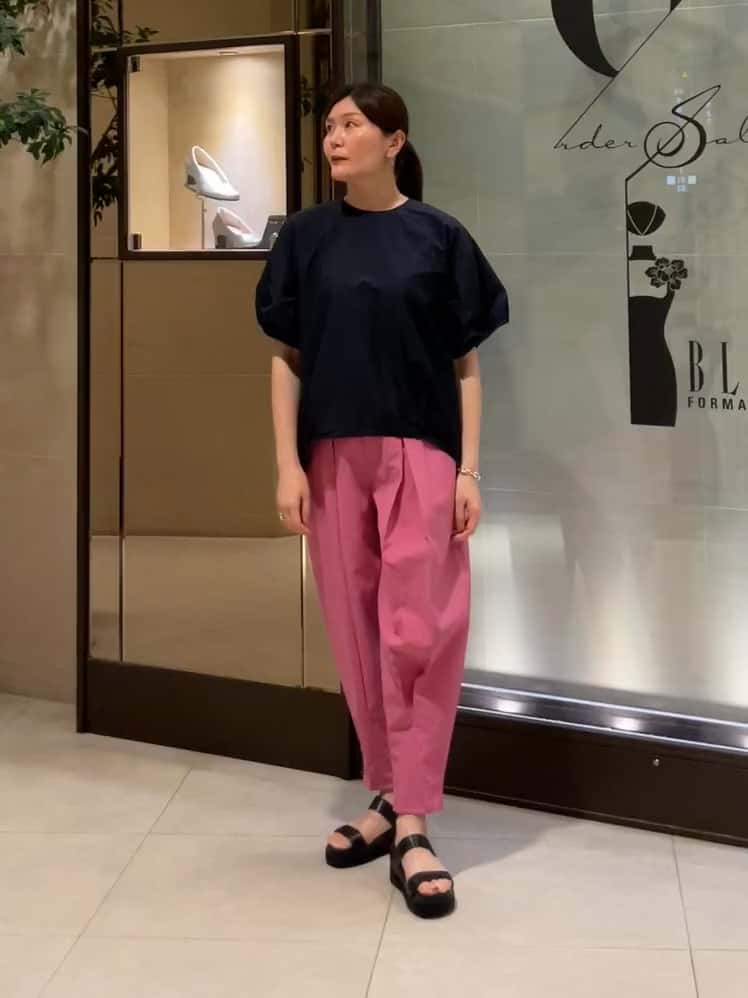 ネイビーの半袖シアーブラウスに、ボックスタック入りのピンクのバレルパンツを合わせた、