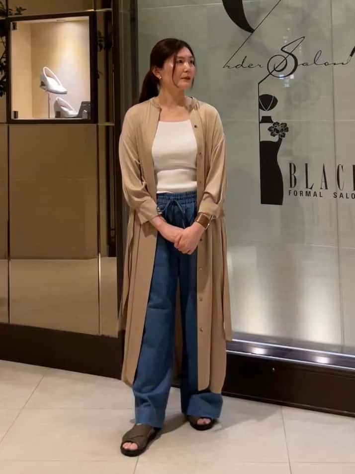 シンプルながらも印象的な大人のレイヤードコーデに。ワンピースとしても前を開けて羽織りとしても着回せるので、