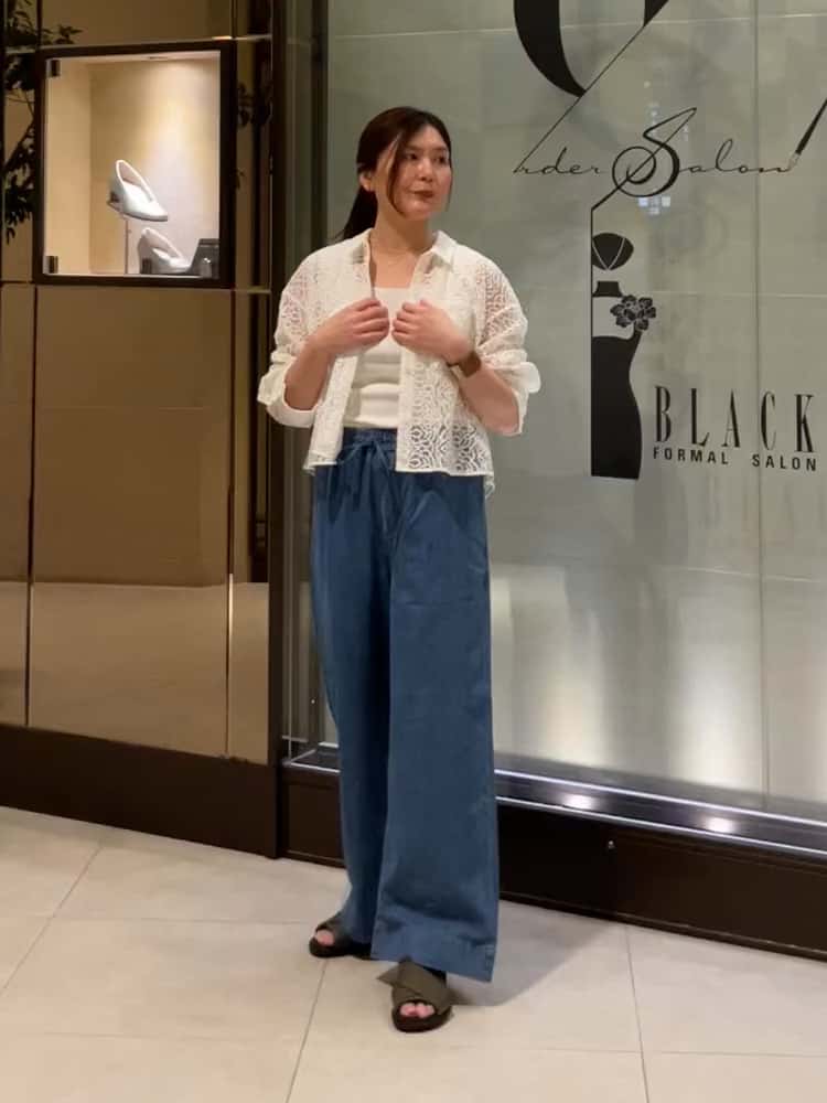 ホワイトのレース短丈シャツに、ブルーのイージーワイドデニムを合わせた