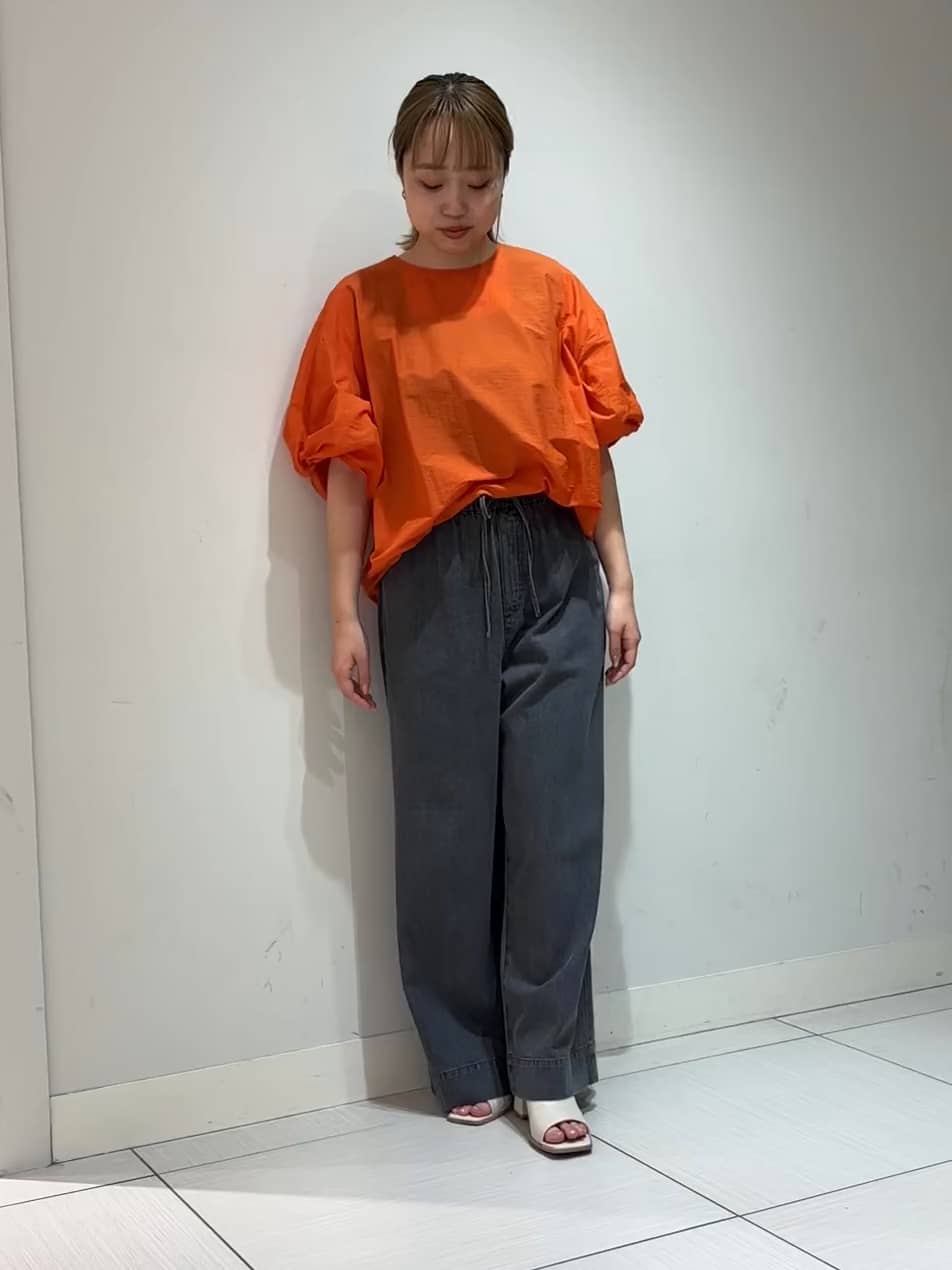 ぱっと目を惹く鮮やかなオレンジカラーが印象的な、シアー素材の半袖ボリュームブラウス。