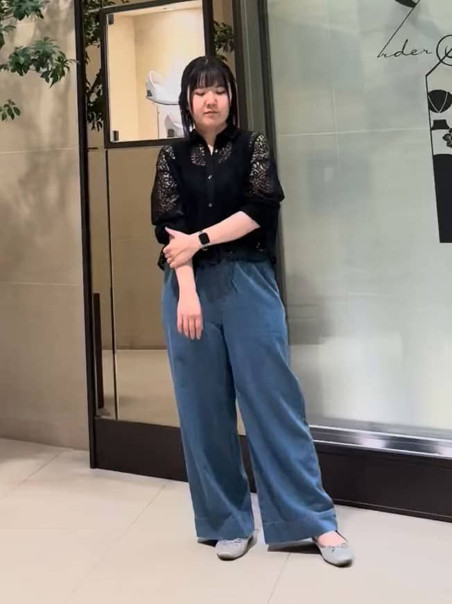 イージーワイドデニムのコーディネート。レースシャツがフェミニンなアクセントとなり、