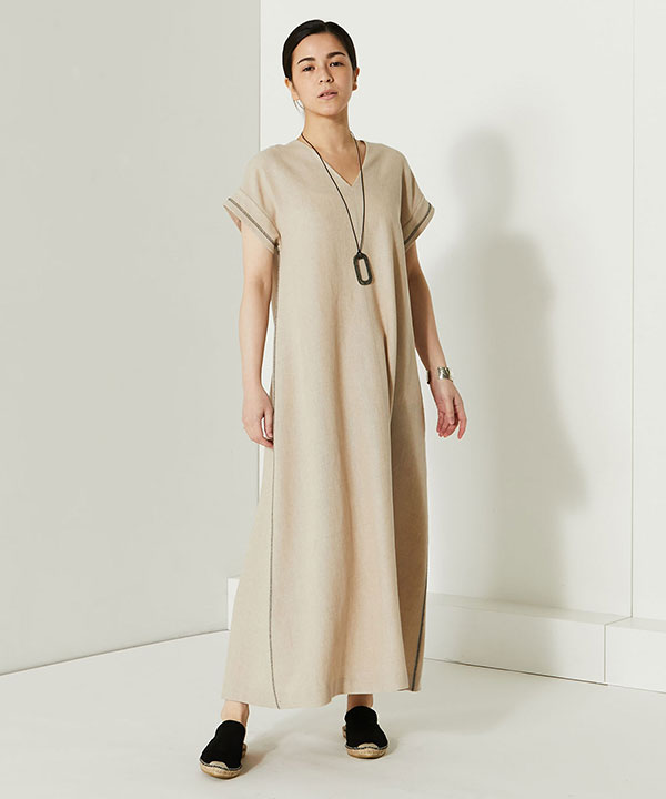 リネン100%のシンプルワンピース。麻の質感が映える、ベージュをチョイスしました。すっきりしたシルエットなので、足元はペタンコサンダルでもスニーカーでも◎
