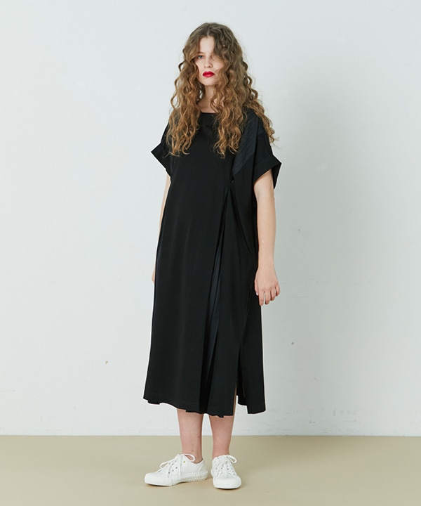 女性らしいプリーツパーツが組み合わさったTシャツワンピに、キャップを被ったゴールデンウィークにぴったりのコーディネート。