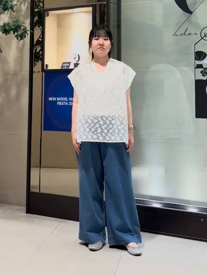 清潔感のある白ブラウスに、ブルーのイージーワイドデニムを合わせて、