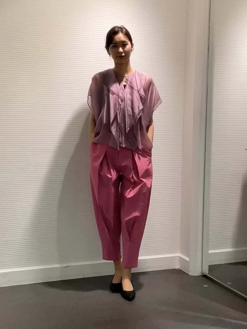 今回は同系色のピンクのボックスタック入りバレルパンツを合わせて、