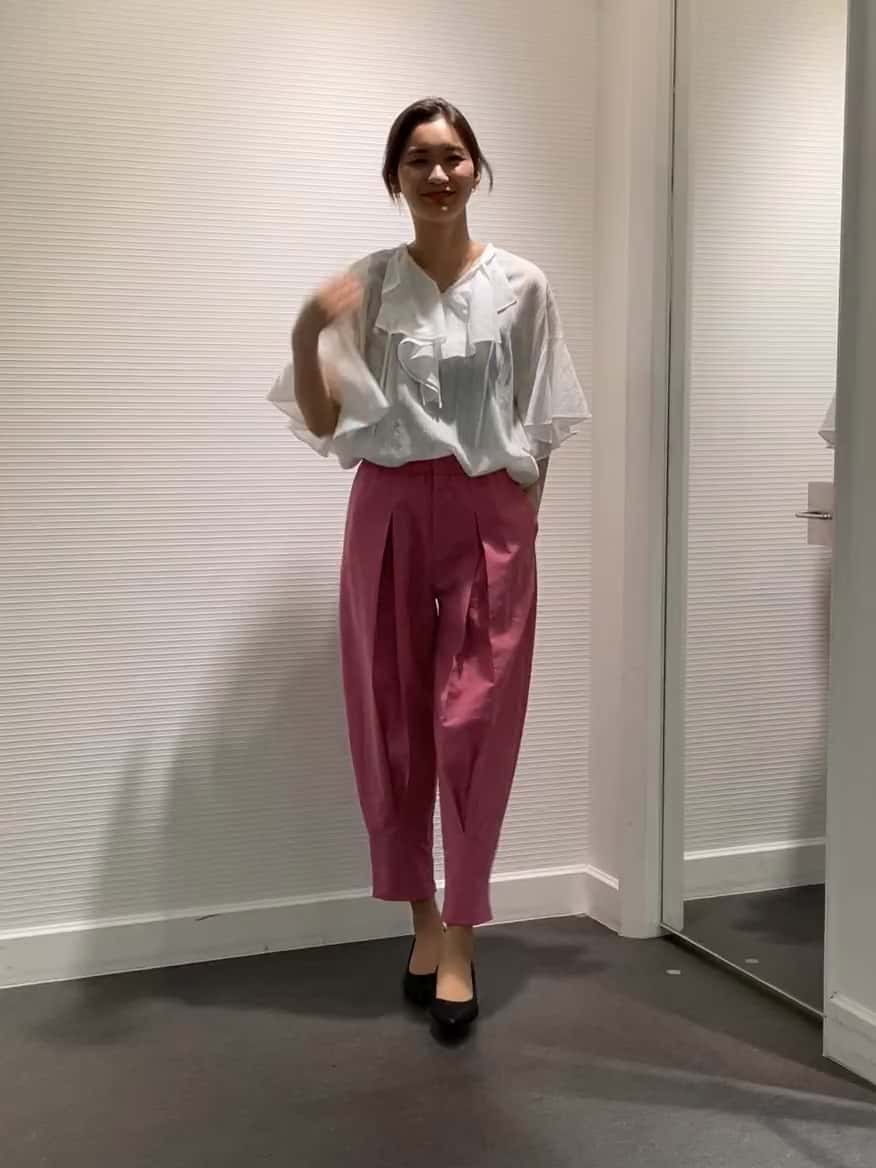 合わせたのは、ほんのり優しいピンクカラーのバレルパンツ。ボックスタックが入ることで