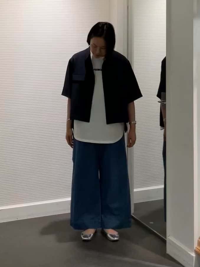ボトムはブルーのイージーワイドデニムでリラックス感をプラスし、全体に抜けをつくることで、