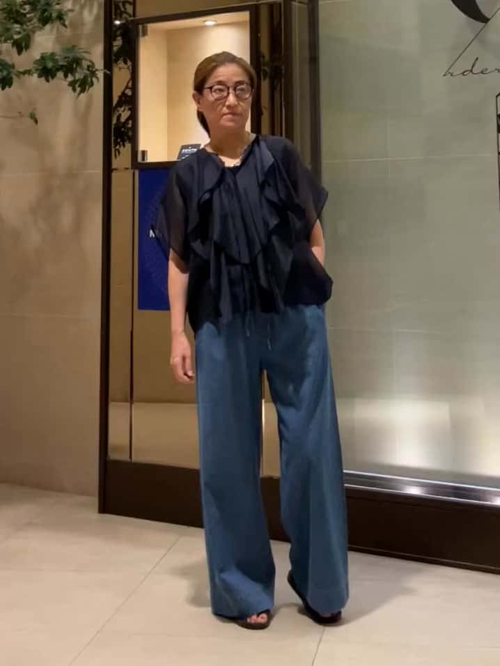 シアーな透け感と軽やかな質感が魅力のネイビーブラウスは、大胆にあしらわれた層状のフリルが印象的。